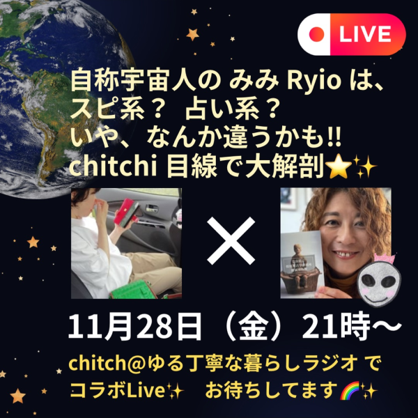 みみRyioさんとコラボライブしました。 みみRyioさんて、何者なのか? 宇宙人って、どーゆーこと? あやしさ満載だったけど 話をしたら、引き込まれちゃいました。 みみRyioさんのチャンネルはこちら