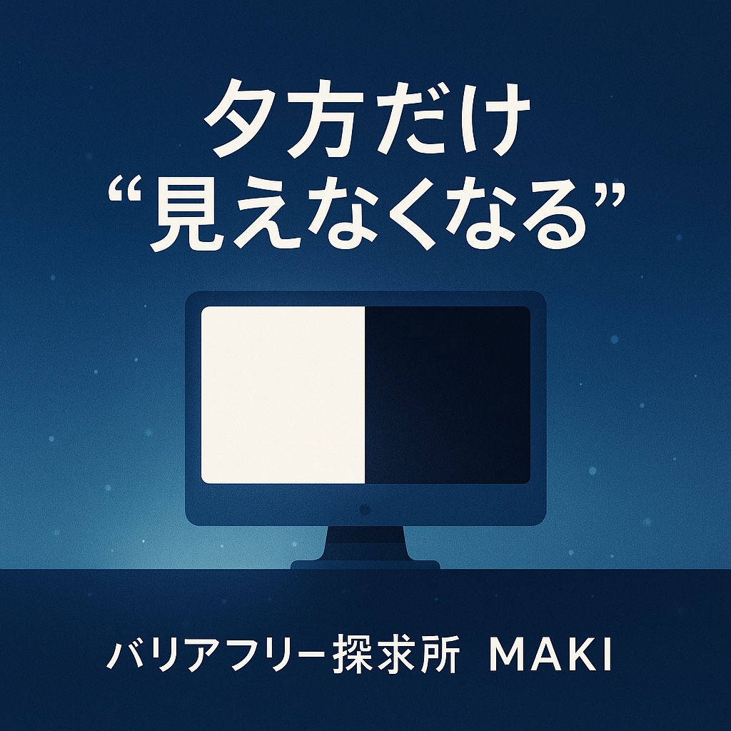 夕暮れに 光失う モニターよ 境目さがす 弱きまなざし #弱視 #ロービジョン #見え方の変化 #網膜色素変性症 #アクセシビリティ #当事者の声 #バリアフリー探求所 #バリ探 今日も楽しんで生きましょう! 今回も聴いてくださりありがとうございました。 疑問・質問・感想など、お気軽にお寄せください。