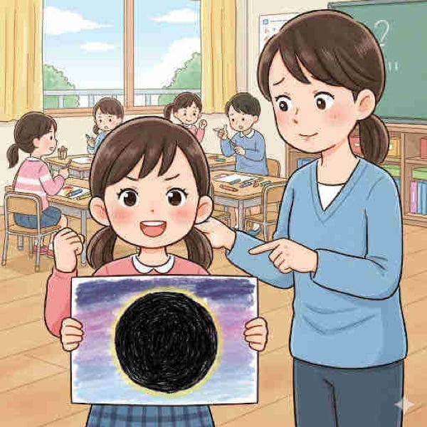 「太陽は赤かオレンジだよ、黒じゃないよ」