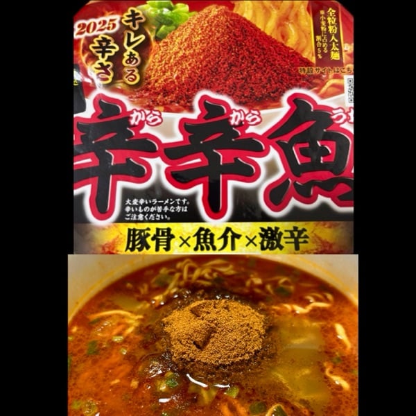 毎年、期間限定で出しよる有名激辛カップ麺やけね😇 マヨネーズは甘えたい‼️🤣 . でも、天神の三越裏にある人気ラーメン店、麺や兼虎 天神本店でなら、実店舗で辛辛魚が食べられるとよね😲 天神本店の店長の修行時代に、東京練馬の麺処 井の庄で辛辛魚を覚えたかららしいね🤔 いつも、長蛇の列で食べるの諦めよるとたい😭