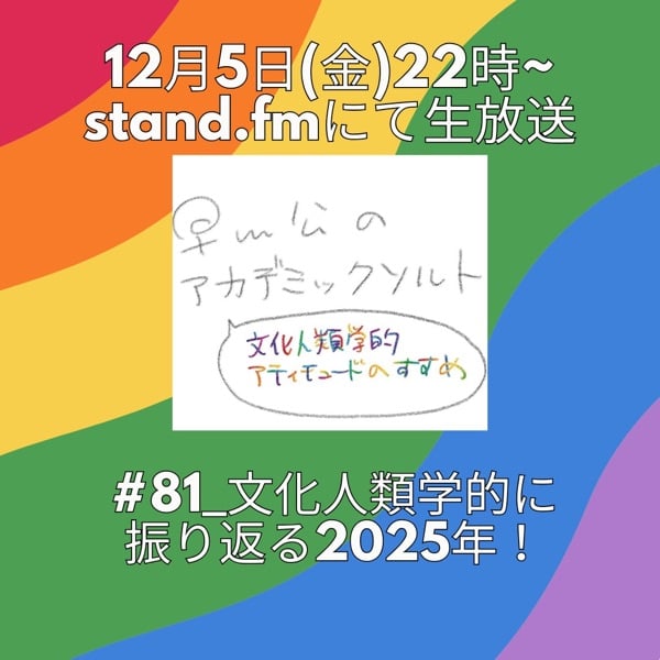 12/5(金)22時~生放送📢 第81回『文化人類学的に振り返る2025年!』 今年、注力したゲスト回✨、そして各テーマを振り返りながら、2025年は文化人類学的にどんな1年だったのか、話してみましょう~!! リスナーの皆様の振り返りのヒントになりますよう🙏 ▼視聴/アーカイブ https://stand.fm/channels/5ff3ba011f63b1cf6894827c
