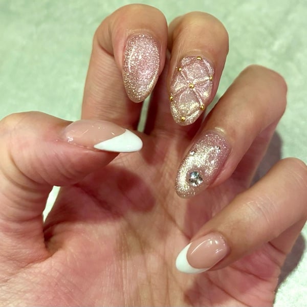 12月のデザインは、写真の通りピンクマグネットのきらめきに、結晶みたいなビジュー、そしてきれいめフレンチの組み合わせ。冬っぽさと華やかさがあって、眺めるたびにちょっと気分が上がる。