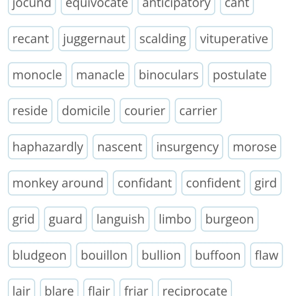 こういう英単語があるんだぁと、まずは英単語自体を認知する(= 発音を知る)必要があると思います。全て、Vocabulary.comでPractice問題が付されているものですから、受験英語や日常英会話などでは使われないものも含まれていますが、ネイティブにとっては知っていて当たり前の英単語ばかりだと思います。 英単語の大体の綴りと音を紐付けるか、音と大体の意味やポジティブな言葉かネガティブな言葉か程度のイメージとを紐付ければ、追々、それが使われている英文にまた出会ったり、英英の定義を見たりしながら、徐々に意味合いや英単語の守備範囲(それぞれの文脈で意図される派生する意味合いの範囲)がわかって行くだろうと思います。 暗記ではありません。何回もその英単語に出会うことで、そのいくつかの側面(意味合い)が見えて来ます。 皆様も、今回これらの英単語に出会ったのですから、これらの単語について、Vocabulary.comのPracticeだけされませんか(私は、まだやり残しているリストが溜まっていますので、このリストのPractice問題をするのは、暫く先になります🙇)。 この49単語が難しければ、私が別にアップしている「似た綴りの単語」のリストでしたら、より覚えやすいと思います。お勧めです🙇。 学習の仕方:⭐上記のVocabulary.comのURLから開いた頁で下にスクロールして、Teachの右隣りのLearnを開いて、Practiceをクリックしてください。10問づつ問題が出されます。適度な間隔が空いた反復学習(spaced repetition)をすることができます。 この問題を解く前に、リストの英単語の英語の定義を音読録音することをお勧めします。これにより、楽にPractice問題が解けるようになります。 exiguous biddable limn limb fetching jocund equivocate anticipatory cant recant juggernaut scalding vituperative monocle manacle binoculars postulate reside domicile courier carrier haphazardly nascent insurgency morose monkey around confidant confident gird grid guard languish limbo burgeon bludgeon bouillon bullion buffoon flaw lair blare flair friar reciprocate incongruous zoic orthopedics prescribe proscribe * 英単語の意味や英文の意味はスマホで調べられます。英文の後ろに「意味」あるいは「訳してください」などと付けてAIモードでクグれば、訳してくれます。パソコンのブラウザ上ではWeblio辞書やGoogle翻訳のポップアップ機能でも簡単に確認できます。🙇 発音記号→ https://docs.google.com/document/d/1aBjEJGU5HDEzurfi4GDFXPNux9O1rh7hKcHR2L1vZLY/edit?usp=sharing   #語学 #英文音読 #英語学習 #英語 #English #vocabulary #語彙 ラインの公式アカウント https://lin.ee/TugoK0K オンライン授業承ります🙇。 https://stand.fm/channels/6384439db4418c968d8043f2/announcements/66f9132791855a0258334a0c