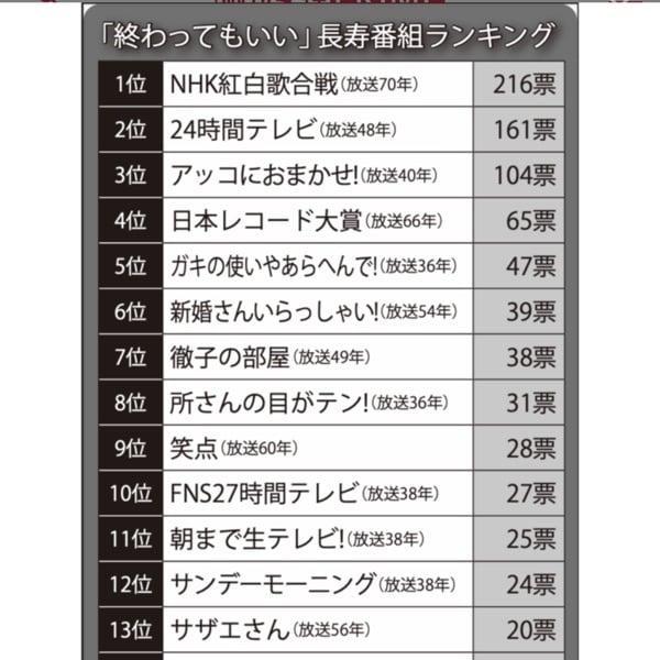 ラジオもそうですが長く続くのは習慣になっているからでもはや内容云々ではないんでしょうね。大晦日は紅白、平日昼間は徹子さん、笑点→サザエさんは身体に染み付いててあー月曜日来るなあ切ない気持ちにも。