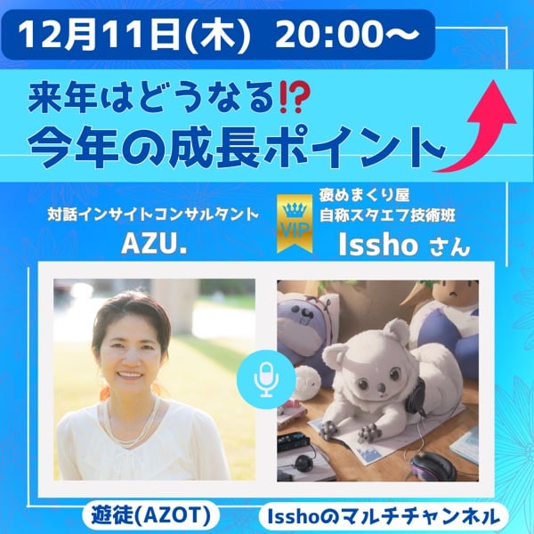 『インターネットラジオ ゆめのたね』のデビューを果たしたIsshoさんの “配信を成長させるコツ” をうかがえました! まず、 「どうしてラジオをやりたいと思ったのか?」 その問いに返ってきた言葉は、とてもシンプルでまっすぐ。 ──子供の頃からそう思ってた❣️ そして今年挑戦したインターネットラジオ ゆめのたねでは、 制限のある環境で番組をつくることを経験し、プロへの1歩1歩を歩んでいるようでした。 さらに今年は、コラボ配信にたくさんされたそう。 全く知らない業界の人と話すことも、 初めて出会う人と対話を組み立てていくことも、 一つひとつが “話す力” を育てる経験になったとのこと。 なかでも、特に心に残ったコラボの話は奥が深かったです✨ 声の世界に挑むIsshoさんの姿勢が、 とてもリアルで、そしてとても学びになる時間でした🥰 「話すことを仕事にしたい」 その夢に向かって歩く人の、変化と成長のストーリー。 ぜひ音声で受け取ってください。 ⬇️Isshoさんの新チャンネル プロフィールに『ゆめのたねラジオ』のリンクがあります 【プロ●●への道】 いっしょう https://stand.fm/channels/688a3ae6b09e6a462ae31873 ━━━━━━━━━━━━━━━ チャンネル登録とGood👍はお忘れなく!!(・ω・)b ━━━━━━━━━━━━━━━ \AZU.はこんな人です/ 🌿 やりたいことを行動に変え、幸せを生きる力を育てよう。 ChatGPTは、その第一歩を支えてくれる心強い相棒です。 私の仕事は、行動できずに止まっている人が、 ChatGPTを通して“自分の願いを叶える力”をつけ、 やりたいことを行動に変えて、幸せを生きられるようにサポートすること。 わたし仕様のAIが育つ|7日間無料メール講座 ▼詳細・お申込はこちら▼ https://azu-tarot.hp.peraichi.com/ai.newsletters 最後までお聞きいただきありがとうございます! ━━━━━━━━━━━━━━━ 「学びを楽しみ、生きるを遊ぶ」 AZOTでケ・セラ・セラしましょう❣️ ━━━━━━━━━━━━━━━ #ChatGPT #AI #AI手相 #セミナー #講座 #ひとり起業 #個人事業主 #ビジネス #ワーママ #人間関係 #コミュニケーション #自分軸 #マインド #学び #言葉 #言葉で整える #タロット #チャネリング #数秘 #占い #潜在意識 #スピリチュアル #AZOT #遊徒 #対話インサイトコンサルタント #AZU #Issho #コラボ