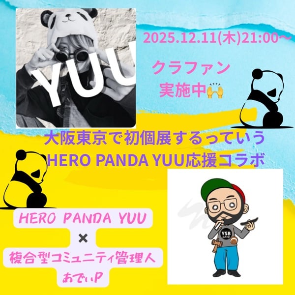 クラファン応援はプロフのリンクからお願いします! https://www.instagram.com/hero.panda.yuu?igsh=cGFiMWcyeWV3dW5t ☝️インスタフォローしてね! 大阪個展 2026/02/10〜02/11 2days 東京個展 2026/03/19〜03/25 1week 初の個展開催とクラファン挑戦!! 応援よろしくお願いします🙌