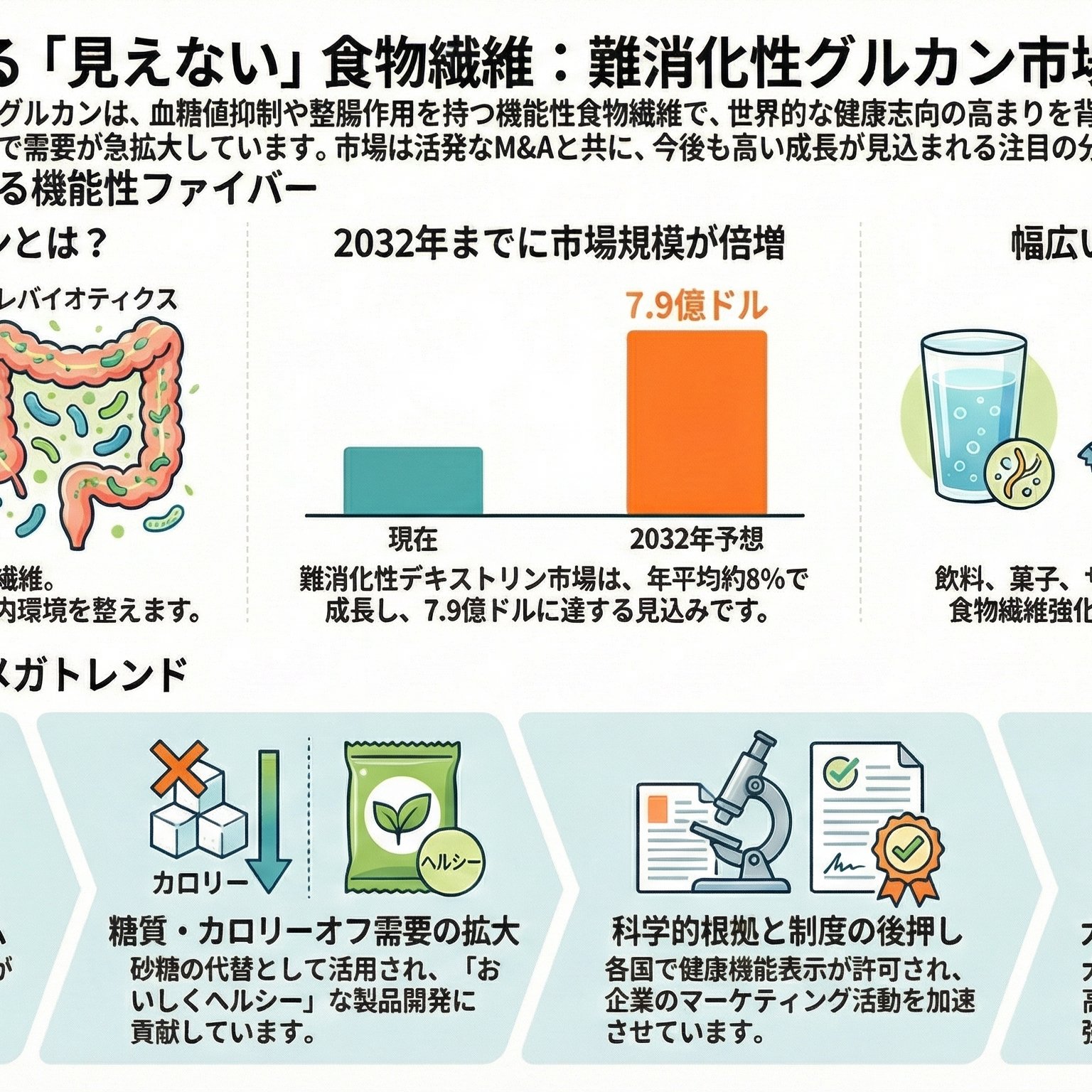 難消化性グルカン業界は、トウモロコシやオーツ麦を原料とする機能性食物繊維の製造分野であり、プレバイオティクス(腸内細菌の餌)としての効果や血糖値コントロール機能が科学的に裏付けられています。世界市場は北米が最大ですが、成長率は中国や東南アジアなどのアジア太平洋地域が最も高く、2024年に売上高が約33%増加した山東バイロンなどの中国企業が台頭しています。