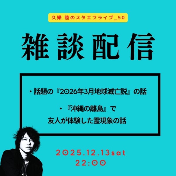 10:23 話題の『2026年3月地球滅亡説』の話 1:27:03 三軒茶屋のカラオケの『霊が出る部屋』の話 1:36:55 『沖縄の離島』で友人が体験した霊現象の話 2:00:22 『カナコさん』登場(沖縄の離島の話の登場人物) 2:20:19 『カナコさんの弟さん』の身に起こった話 3:00:30 雑談コーナー(恋バナ、メンヘラ、男性恐怖症、SASUKE、他) (Total Time:6:31:50) #久樂陸のスタエフライブ