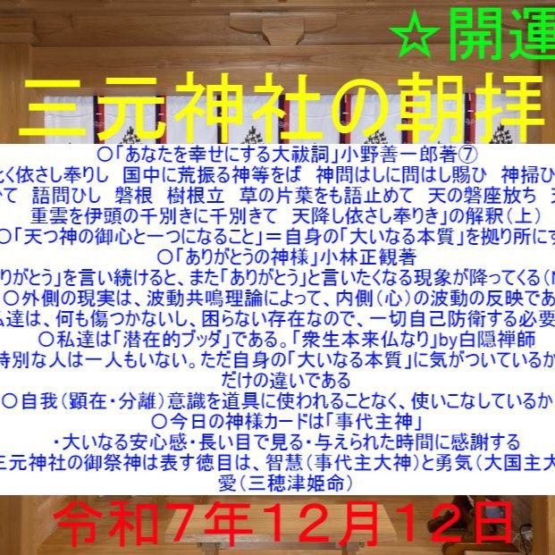 毎朝8時から、修祓、大祓詞、日供詞、龍神祝詞、般若心経、光明真言など)ご唱和出来る方はご一緒にご唱和ください。