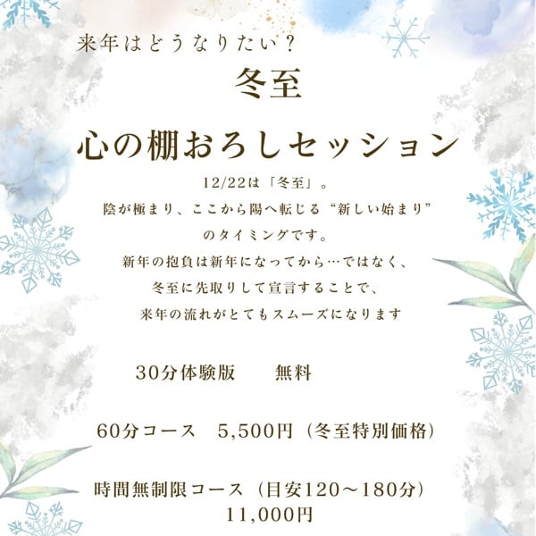 もうすぐ冬至がやってくる。 陰きわまって陽となる。 あなたはどんな風になっていきたい? 変化の年だからこそ来年に向けて整えていこう! 冬至心の棚卸しセッションお申し込み