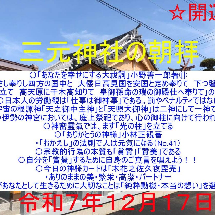 毎朝8時から、修祓、大祓詞、日供詞、龍神祝詞、般若心経、光明真言など)ご唱和出来る方はご一緒にご唱和ください。