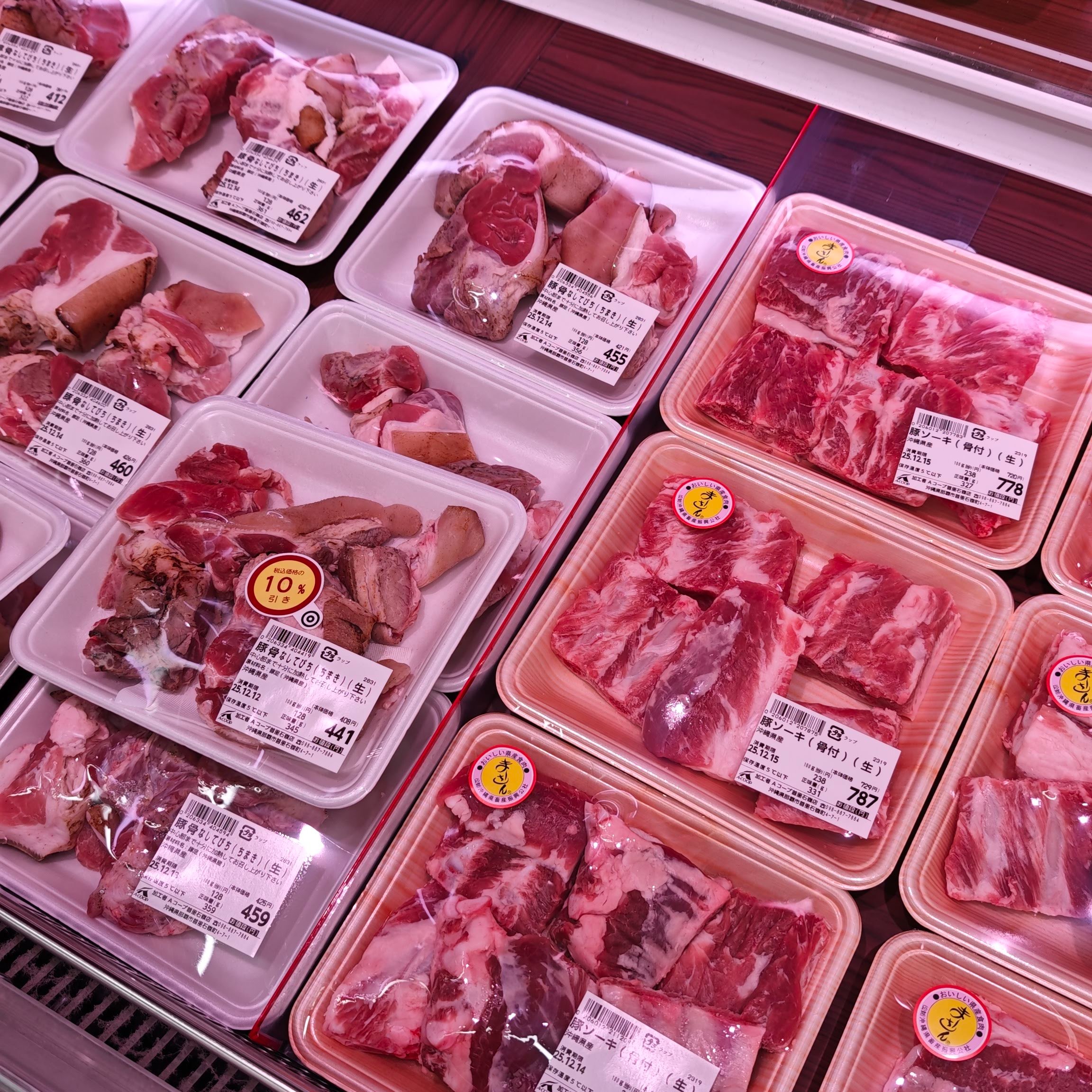 題名は、沖縄弁ってマジ難しいねぇ、って感じの意味です。 はい、ぜんぜんわからんかったのでカンニングしまくりました。 外国語並みに難しいネイティブ沖縄弁「しまくとぅば」に触れた余韻をすこし書いておきます。 そもそも沖縄弁って、沖縄弁ではなんと言う? ざっくり2種類有って、 ・しまくとぅば → 公式的な呼称で、琉球諸語全体が範囲。島により言葉が違う。 ・うちなーぐち → 沖縄本島寄りの日常会話で使われる言葉の呼称。 ということ。 なので、実際に沖縄本島に観光などで行って触れるのは、しまくとぅばの一種である、うちなーぐちってことですね。 でもまぁ通りすがりの現地の方々が喋ってる言葉ってのは、聞いた限りでは、イントネーションが沖縄流のほとんど標準語ですね。 いざというときにnativeうちなーぐちが炸裂するって感じ?よくわかりませんが。 でも街中の表示にはたまに結構わからんものもあります。 まぁその中の超一例ですが、スーパーの豚肉コーナーの表示は結構キテますね。 1)豚骨なしてびち(ちまき)(生) 2)豚ソーキ(骨付) 3)まーさん → おいしいの沖縄弁(うちなーぐち) 以上について解説を試みると、 1)「てびち」 沖縄で豚足(とんそく)を輪切りにして煮込む料理のこと。​ でもしかし、本来のてびちの意味は、肉や野菜を煮込んだ料理を指す、というか指していたってことらしいっすね。 https://enjoy-life-forever.com/tebiti-izumi-syokudou/ 精肉コーナーに並んでるということは、生肉扱いの豚足ってことです。 関東で食べる豚足は、普通は骨だらけの足の先端の部分て感じですが、韓国料理のワンジョッパルなどスネの部分などは骨無しで食べられたり、沖縄ではこうして骨無しに加工された食べやすいてびちが超ポピュラーです。んむ、美味くてやめられないっすよ。 「ちまき」は、その骨抜き豚足をゼラチン質ごと固めたもの(コラーゲンたっぷりの煮こごり・巻物のイメージ)を指す商品名・形状名。 「生」は、すでに味は付けてある/軽く下茹ではしてあるが、「まだ加熱調理前の状態」という意味で、生の素材または半加工品というニュアンス(だと思われる)。 というわけで、豚骨なしてびち(ちまき)(生)は東京弁で言うと、 「骨を抜いた豚足を巻き物みたいにしてちまき状に固めた生の下ごしらえ品」くらいのイメージですかね。 2)豚ソーキ(骨付) ソーキは沖縄で豚の骨付きあばら肉(スペアリブ)のこと。 沖縄そばに乗せたり、甘辛く煮付けたり、ソーキ汁にしたりする部位ですね。 東京弁で言うとすると、「豚の骨付きあばら肉(スペアリブ)」 ​ 3)まーさん おいしい です。完全に標準語から逸脱してます。はい。 今回の沖縄本島訪問で、ネイティブの沖縄料理店のひとつ石嶺食堂で食べて、ホントにうまかったので、唯一サラリと言って通じてしまったうちなーぐちを以下に。 ごちそうさまでした。とても美味しかった! をしまくとぅばでは、 「くゎっちーさびたん。いっぺーまーさんやさー。」 ちなみに いただきます → くゎっちーさびら おいしい! → いっぺーまーさん やいびーん (おいしかったの意味にも使えるらしい) 沖縄訪問の際は、ぜひこのフレーズを覚えておいてくださいませ。 P.S. こんな動画もみてしまったー https://www.youtube.com/watch?v=rJWjQZgm5ss ------- Aviv's Links https://bento.me/Paloj