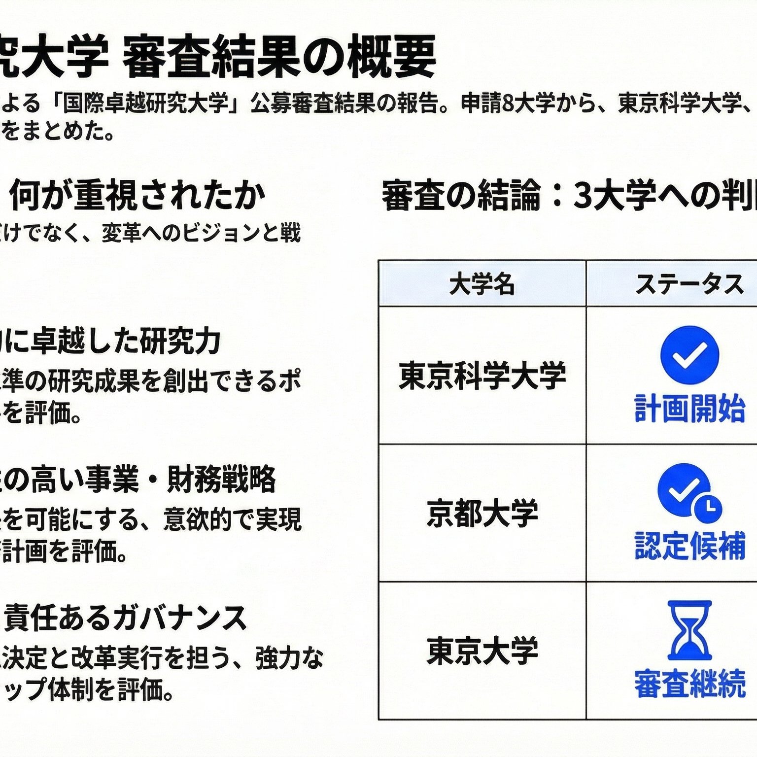 文部科学省の有識者会議は12月18日、国際卓越研究大学の認定に関する審査結果を公表しました。東京科学大学については、2026年4月からの体制強化計画の開始を認可し、厳格なモニタリングを行う方針です。 一方、京都大学は認定候補として計画の磨き上げを求め、東京大学についてはガバナンス面の確認等のため審査を継続します。大阪大学、早稲田大学など他の5大学は、意欲的な提案が高く評価されたものの、今回の認定候補には選ばれませんでした。会議は、選定された大学が日本の大学改革を先導することへの強い期待を示しています。