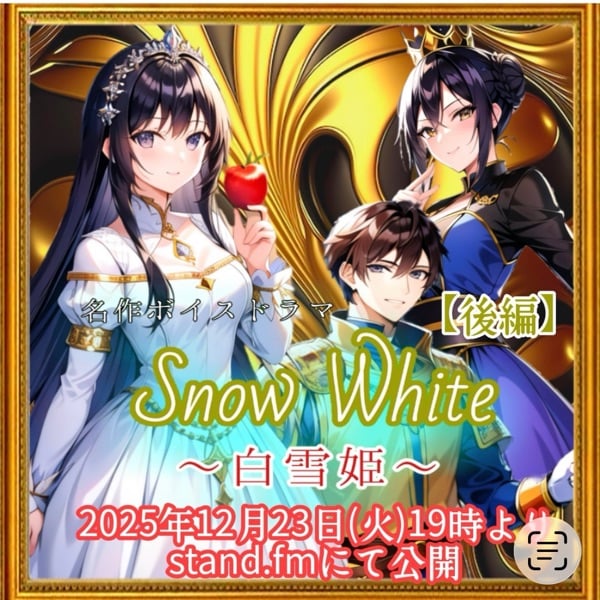 ボイスドラマ 『Snow White~白雪姫~』❄️ 【後編】 いよいよ公開🎬 12月23日(火)19時より 相良ユウさんのチャンネル 【前編】はこちら🔽 https://stand.fm/episodes/6924347294fd515b5c86588d 【後編】はこちら🔽 https://stand.fm/episodes/6949261a32a461024005d6c1 #ボイスドラマ #朗読 #白雪姫 #Snow White