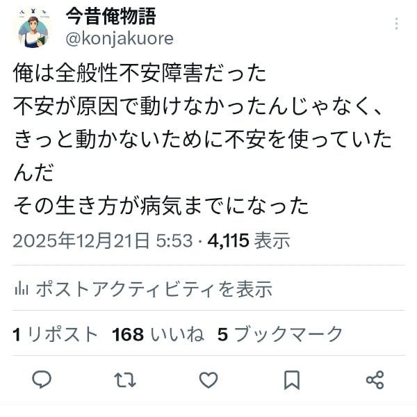 不安があるから動けなかったんじゃない。 動かないために、不安を使っていたのかもしれない。 アドラー心理学の「目的論」という視点から、 全般性不安障害とうつを経験した自分の回復過程を振り返ります。 不安は敵じゃなかった。 守るための感情だった。 これは「正解」ではなく、 あくまで自分の実感です。 今、苦しんでいる誰かが 自分を責めずに済むヒントになればと思って話しました。