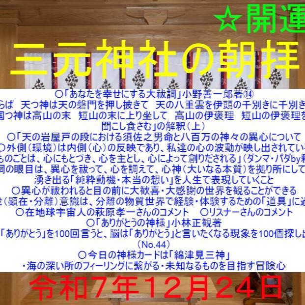毎朝8時から、修祓、大祓詞、日供詞、龍神祝詞、般若心経、光明真言など)ご唱和出来る方はご一緒にご唱和ください。