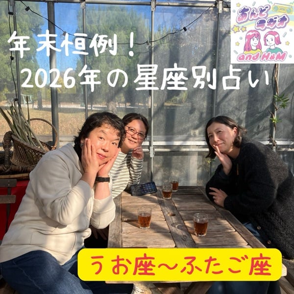 【うお座~ふたご座】 楽しいことユニットand H&Mのヒロコとミツコがお送りする『あんどラジオ』、217回目の配信です。 年末ですね!ということで、今年も占い師330さんとひっちゃんをお呼びして、星から見る2026年の運勢をお話します! 年末年始にまったりお聞きくださいね♪