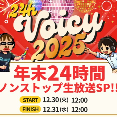 パパ丸山さん×しんたろーたりーさん×ヒデアキさんによる、Voicy年末ビックイベント 24hVoicy紹介 なんとパパ丸山さんのご好意で、24hVoicyオープニング(12/30 昼12時)にVoicy loversが呼んでもらえることになりました~ 2025年末は、Voicyの中心でVoicy愛を叫びます笑 みなさん年末もVoicyでお楽しみください