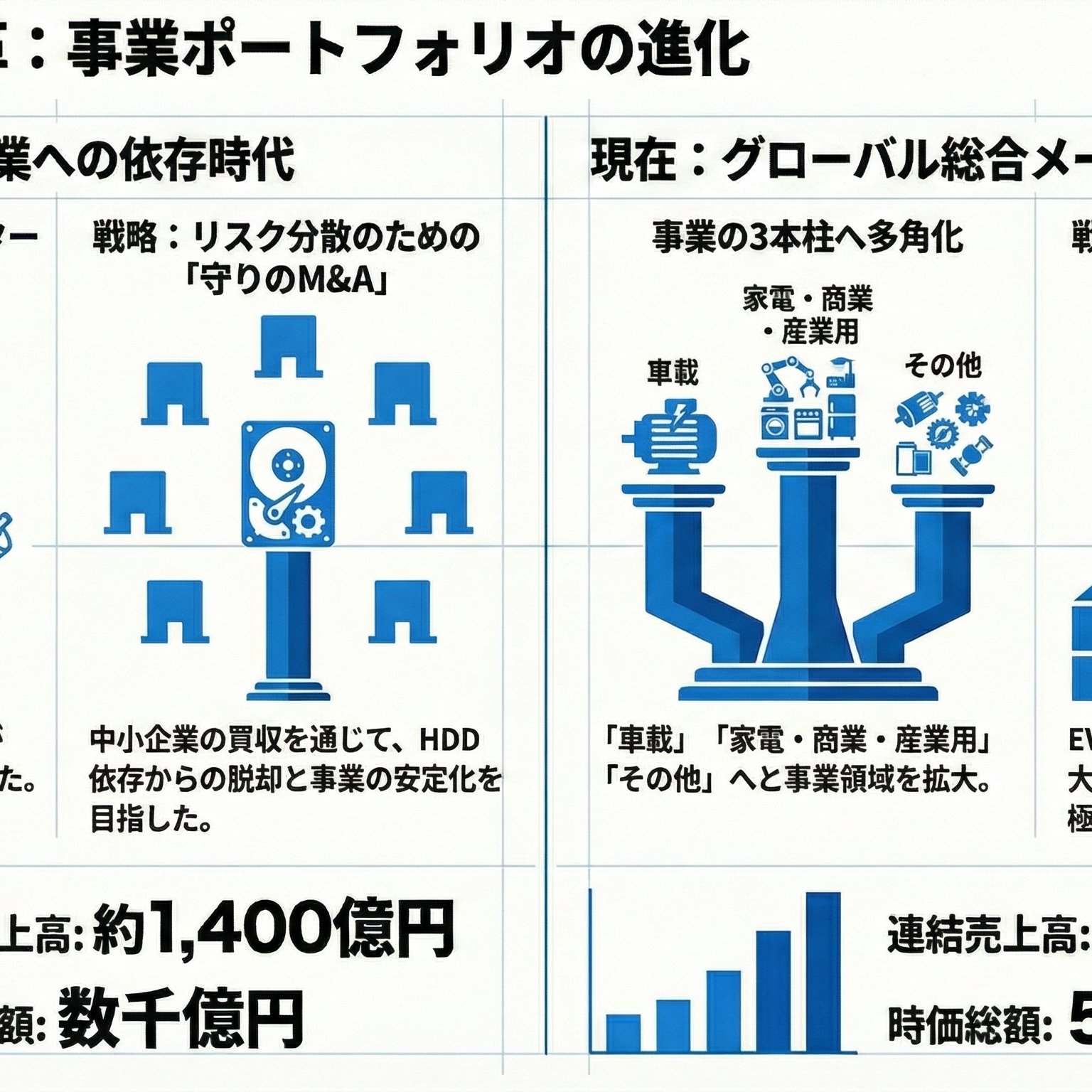 2000年、ニデック(旧日本電産)は売上の約8割をHDD用モーターに依存する一本足打法だった。IT不況で赤字転落の危機に瀕した同社は「技術と時間を買う」M&Aへ大きく舵を切る。シーゲイトの工場やエマソン、ヴァレオの事業部門などを次々と買収し、弱点だった車載や大型産業用分野を補完。単なる多角化に留まらず、工作機械まで取り込み垂直統合を進めた結果、売上は1400億円から2兆円超へ、時価総額は25年で数十倍に急拡大した。ニッチな部品屋からEV時代の「世界の総合モーターメーカー」へ進化したポートフォリオ転換の極意がここにある。