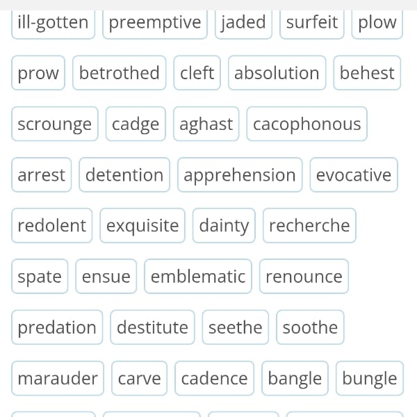 https://www.vocabulary.com/lists/9911373 * 学習の仕方:⭐上掲のVocabulary.comのURLから開いた頁で下にスクロールして、Teachの右隣りのLearnを開いて、Practiceをクリックしてください。10問づつ、100問以上ぐらい問題が出されます。適度な間隔が空いた反復学習(spaced repetition)をすることができます。 解き終わると正答率など表示されます。 この問題を解く前に、リストの英単語の英語の定義を音読録音することをお勧めします。これにより、楽にPractice問題が解けるようになります。 * ill-gotten preemptive jaded surfeit plow prow betrothed cleft absolution behest scrounge cadge aghast cacophonous arrest detention apprehension evocative redolent exquisite dainty recherche spate ensue emblematic renounce predation destitute seethe soothe marauder carve cadence bangle bungle luxuriate sheepishly despoil introspective introvert stronghold ostensibly scourge resourceful proactive grovel quixotic berth discharge * 英単語の意味や英文の意味はスマホで調べられます。英文の後ろに「意味」あるいは「訳してください」などと付けてAIモードでクグれば、訳してくれます。パソコンのブラウザ上ではWeblio辞書やGoogle翻訳のポップアップ機能でも簡単に確認できます。🙇 発音記号はこちらでも検索できます。→ https://docs.google.com/document/d/1aBjEJGU5HDEzurfi4GDFXPNux9O1rh7hKcHR2L1vZLY/edit?usp=sharing   #語彙 #語学 #毎日音読 #毎日配信 #英文音読 #只管音読 #英会話初心者 #家庭菜園 #英語学習 #英語 #English #vocabulary ラインの公式アカウント https://lin.ee/TugoK0K 友だち登録よろしくお願いいたします🙇。 音読・読解または語彙についてのオンライン授業承ります🙇。 https://stand.fm/channels/6384439db4418c968d8043f2/announcements/66f9132791855a0258334a0c