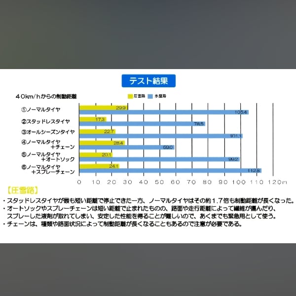 矢部様 ABSは制動距離を短くしないのですね。勉強になりました。 車間を広く取って、ゆっくり運転しようと思います。 チェーン、つけたいです笑