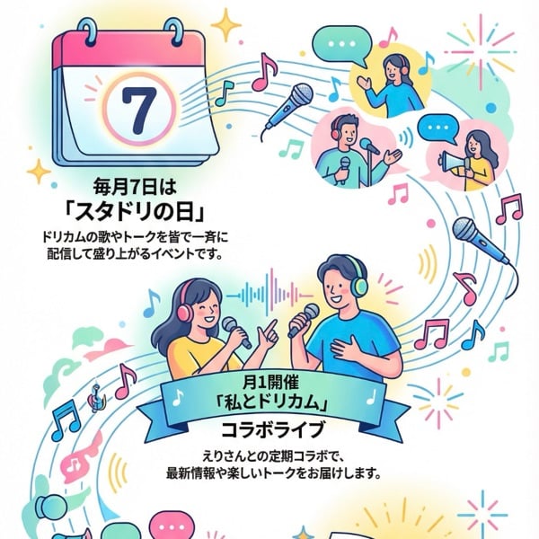 音声配信プラットフォーム*stand.fmで活動する「スタエフドリカム部」は、人気グループ*DREAMS COME TRUEが好きな人の交流拠点です。運営者のふくちゃんは、毎月7日を「スタドリの日」と定め、楽曲の歌唱や歌詞の分析、最新情報の共有などを通じてコミュニティを盛り上げています。定期的な*コラボライブや他アーティストとの繋がりを重視した企画も盛んで、ドリカム好き同士が親睦を深める場となっています。2026年に向けたライブ配信の告知など、リスナー参加型のコンテンツが充実しているのが特徴です。このように、このチャンネルはドリカムの魅力を多角的に発信し、共通の趣味を持つ人々を繋ぐ音声コミュニティ*としての役割を担っています。ドリカムファンじゃない皆さんもぜひ遊びに来てくださいね♪