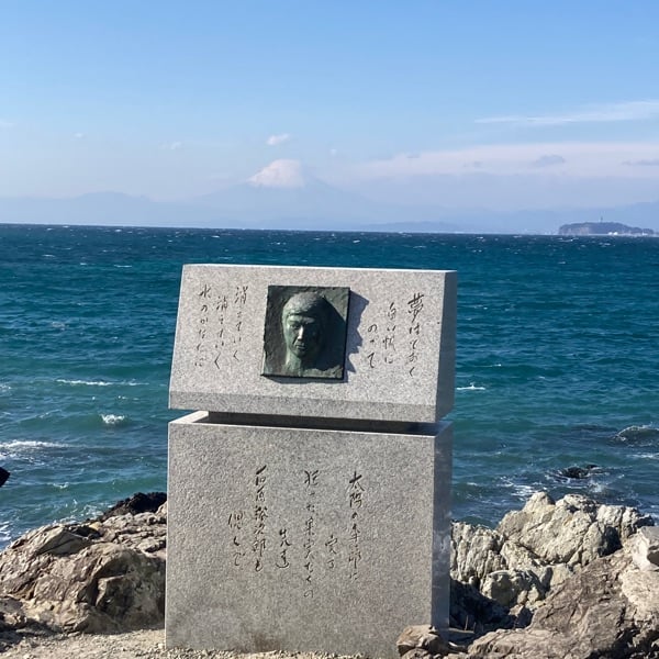 サムネは神社裏にある海岸の写真です。 富士山と江ノ島をバックに石原裕次郎の石碑が映えます✨