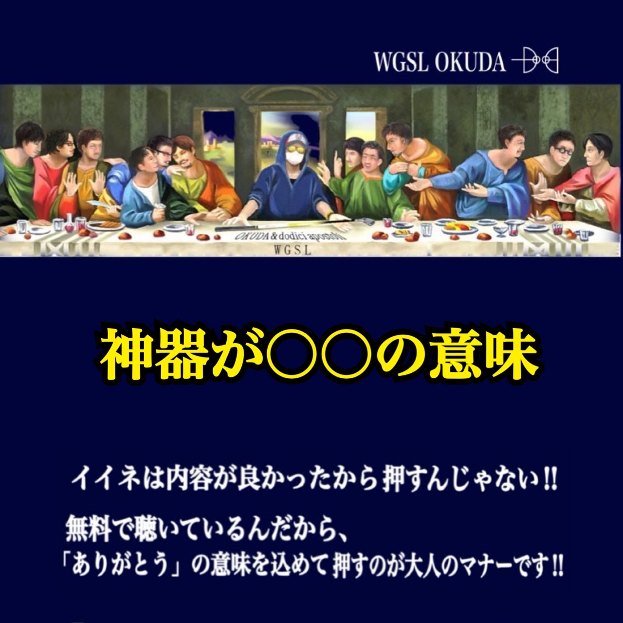 OKUDA様 WGSLの皆様 本日は12時間限定配信ありがとうございます。 神器と聞いて最初に思いついたのが 剣・盾・◯でした。 OKUDA様の考えを聞いて まさに仕事中の自分を言われていると思いました😅 常日頃これを意識して行動していかなと心に留めました‼️ 冒頭のMatsuさんの 「なんか好きな…」に爆笑しました😆 本日は12時間限定配信ありがとうございました。 感謝しております。
