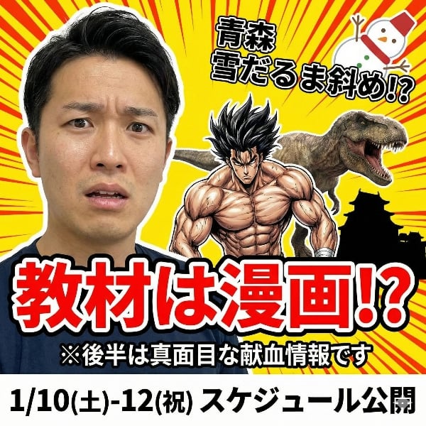 後半(16:30頃〜)は、今週末の3連休(1/10〜1/12)の青森県内献血バス運行スケジュールをしっかりお伝えしています!