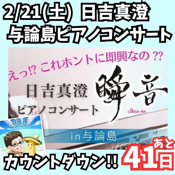 🎵日吉真澄🎹与論島コンサート🎵 来年2月21日開催まで、あと42日‼️ 🎹日吉真澄・与論島ピアノコンサート『駿音』公式HP🎹 ⇒  https://hiyoshi-piano-yoron.hp.peraichi.com/ ⇧⇧⇧ 現在、こちらHPにて、応援してくれる方(支援・スポンサー)募集しております🙏 🎙️本日の朗読リレー担当者🎙️ 第1楽章第3話🎙️「美と健康の総合スクール」まつださなえさん⇒  https://stand.fm/episodes/69620258af987f88d98c787f ≡≡≡≡≡≡≡≡≡≡≡≡≡≡≡≡≡≡≡≡ 今日は、コンサートの具体的な内容などをまとめて話してみました。 🎹日吉真澄ピアノコンサート『瞬音』 in 与論島 📍会場:茶花小学校 体育館 🕠2月21日(土) 17:30開演/入場無料 📺YouTube無料配信も準備中です。 💃コラボ出演者 ・エイサー団体「舞弦鼓」 ・親子合唱「ヨロンどれみ」 ・筆文字パフォーマー「政所佳代」 ・バレエダンサー「しょこらん」 太鼓の響き、歌声、筆が走る瞬間、そしてピアノと舞う身体。 ジャンルを越えた表現が一つの空間で重なり合う、ここでしか味わえないライブ体験です。 さらに、2月17日〜20日の4日間は、島内の小学校3校・中学校1校・高校1校、計5校での訪問演奏を実施予定。 子どもたちの“目の前で生まれる音”に出会える、特別な時間になります。 この企画では、学校訪問・会場・オンライン配信を合わせて、1000人に音楽を届けることを目指しています。 1月15日には、会場からYouTube配信の実験ライブも予定。 この1年越しのコンサートを、島の子どもたちへ、そして島内外の皆さんへ。 「その瞬間に立ち会えた」という記憶を、ぜひ一緒に刻めたら嬉しいです。 ≡≡≡≡≡≡≡≡≡≡≡≡≡≡≡≡≡≡≡≡ 📖Kindle『与論島・小さな島のピアノ協奏曲: 〜「動けば変わる!」で駆け抜けた100日間の物語〜』 https://amzn.asia/d/eijaELt 🔗 朗読リレーまとめページ 🔗 全参加者・各話リンクはこちらから⇒  https://note.com/navy0513/n/n5f347954af73 📚Kindle本の連載形式での「全文無料公開」スタートします note⇒  https://note.com/navy0513/n/n809955c79b24 アメブロ⇒  https://ameblo.jp/thako0513/entry-12951754434.html コンサートまであと約1ヶ月半! 与論島の子どもたちにも、この“心が動く瞬間”を届けたい。そんな気持ちで準備を進めています。 YouTube「ヨロンブルー」も、よかったらぜひ聴いてみてください。きっと与論の風景が、少しだけ近く感じられるはずです。 【えっ⁉️これ本当に即興なの⁉️】 BGMは、日吉真澄さんの即興ピアノ「ヨロンブルー~島のかぜ、波のひかり~」 ⇩⇩⇩ コンサートまでに10000回再生目指してます‼️ (現在、約4400再生) 【1日1ヨロンブルー】ご協力お願いします🙇⇒  https://youtu.be/x5eAC-Jd-OI?si=CUtIL7gdLRplZxuw 📻ひよさんのスタエフチャンネル『エモくて沁みる深夜のピアノライブ』⇒  https://stand.fm/channels/5edf0b0d9c38bc0326ee25f4 【日吉真澄🎹ツアー】 11/29(土) 大阪 16:00 終了 12/7(日) 福岡 16:00 終了 12/27(土) 札幌 17:00 終了 1/17(土) 愛知 17:00 1/31(土) 東京(SOLD OUT) 18:00 2/21(土) 与論島 18:00 2/24(火) 沖縄 与論島コンサートまでの100日間、ひよさんの魅力、コンサート情報を、 スタエフ、X、Instagramでも、毎日、配信‼️ (インスタでの文章中のリンクは、ストーリー&ハイライトから飛べます) #日吉真澄与論島ピアノコンサート #日吉真澄 #ピアノ #即興演奏 #与論 #与論島 #ヨロン #ヨロン島 #yoron #焼肉 #すみ火焼肉サム