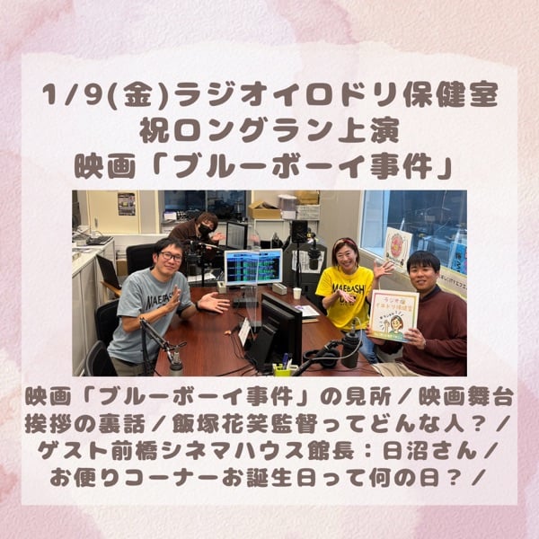 映画ブルーボーイ事件のみどころ/映画舞台挨拶の裏話、飯塚花笑監督ってどんな人?/ゲスト:前橋シネマハウス館長:日沼さん/お便りコーナーお誕生日って何の日?/