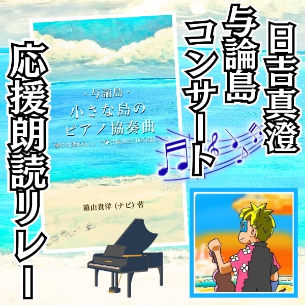 #与論島ピアノコンサート・朗読リレー企画 ▶ この朗読リレー 初回配信(主催者・ナビ枠)⇒  https://stand.fm/episodes/695dea2c03da56bc77671aae  ▶ 前回の朗読 🎙️ 「ハワイアンやすお」さん⇒  https://stand.fm/episodes/6962322f89233bc8ec927998 ▶ 次回の朗読 🎙️ 「コージィーさん」配信チャンネルは主催・ナビチャンネルにて⇒  https://stand.fm/episodes/695dea2c03da56bc77671aae 📹コージィーさんのYouTubeチャンネル『音声配信から飛び出した【ひとり放送局】』⇒  https://youtube.com/@cozycorner_jp?si=JtrucLJxAf2T9uqk 📖 この朗読リレー配信について 📖 この配信は、Kindle本 『与論島・小さな島のピアノ協奏曲』 をつないでいく朗読リレー企画です。 与論島の焼肉屋「ナビ」が、スタエフで出会った、ピアニスト・日吉真澄さんの与論島コンサート開催を目指して駆け抜けた、約100日間の実話。 そしてこの物語は、まだ終わっていません。 物語の結末は、来月2月21日(土)、実際の与論島で行われるピアノコンサート本番へと続いていきます。 ぜひ、この物語の「その先」を、一緒に迎えてもらえたらうれしいです。 🔗 朗読リレーまとめページ 🔗 全参加者・各話リンクはこちらから⇒  https://note.com/navy0513/n/n5f347954af73 🎹 日吉真澄・与論島ピアノコンサート『瞬音』in 与論島🎹 2026年2月21日(土) 与論島にて開催 入場無料・YouTube無料配信 1年前にやむを得ない理由で延期をしたコンサートを、1年越しについに開催します。 島の方も、島外の方も、オンラインからも、誰もが一緒に感動を共有できるコンサートを目指しています。 【応援してくれる方(支援・スポンサー)募集しています🙇】  ⇩⇩こちらのHPの途中にあります⇩⇩ 🔗 与論島コンサート公式HP 🔗 ⇒ https://hiyoshi-piano-yoron.hp.peraichi.com/ 🎹 日吉さんのおすすめの演奏🎹 【えっ⁉️これ本当に即興なの⁉️】…と思うほどの心を揺さぶる演奏です✨️ 即興演奏『ヨロンブルー 〜島のかぜ、波のひかり〜』⇒  https://youtu.be/x5eAC-Jd-OI?si=CUtIL7gdLRplZxuw 📝 note・アメブロにて全文無料公開 この物語を、与論島コンサート前により多くのみなさんに届けたい!という思いから、全文無料公開をしています。 2月半ばまで、約30日かけての連載形式でアップしていきます。 🔗 note ⇒  https://note.com/navy0513 🔗 アメブロ ⇒  https://ameblo.jp/thako0513/ 📘 一気に読みたい方はこちら Kindle出版『与論島・小さな島のピアノ協奏曲 〜「動けば変わる!」で駆け抜けた100日間の物語〜 』 https://amzn.asia/d/eijaELt 🎧 YouTubeでも聴けます 今後、朗読リレー音声は、 YouTubeにも順次アップしています。⇒   https://youtube.com/@yoron36?si=Ckq78Ryy4jCMMKG0 #与論島 #与論島ピアノコンサート #与論島小さな島のピアノ協奏曲 #日吉真澄 #朗読リレー #朗読
