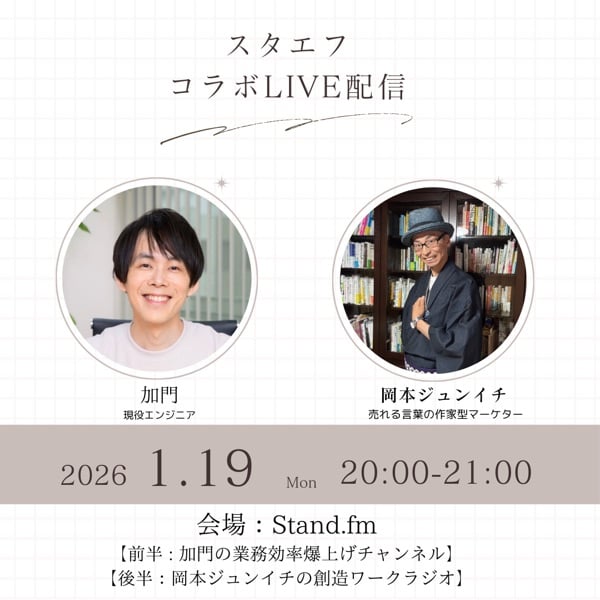 今回のライブは作家的マーケターのオカジュンさんです。