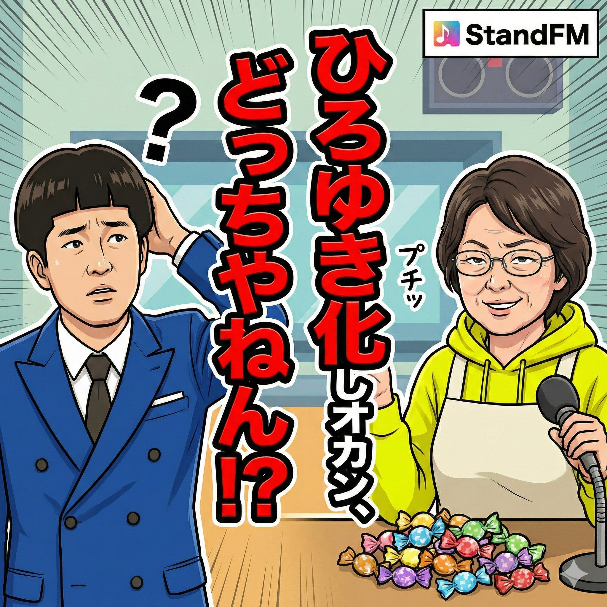 「でも、話し終わったら必ずアメちゃんを配る」 → ほなひろゆきと違うかぁ! あの人はデータと嫌味は配るけど、糖分は配らんのよ!