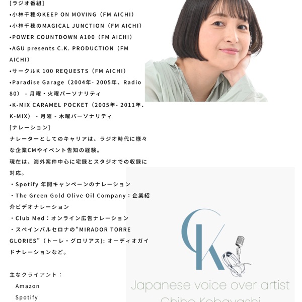 小林千穂です。ラジオパーソナリティ歴14年。結婚、出産して2人の子の母です。現在はvoice over artist (ナレーター)。主に海外企業やエージェントと仕事しています。 趣味は、キャンプ、編み物、旅行。それから、音楽、舞台、スポーツ観戦も大好き。 趣味の話や子育ての話はもちろん、最新のボイスサンプルも流していきます! あらぬ方向にいきがちなトークをお楽しみ下さい。