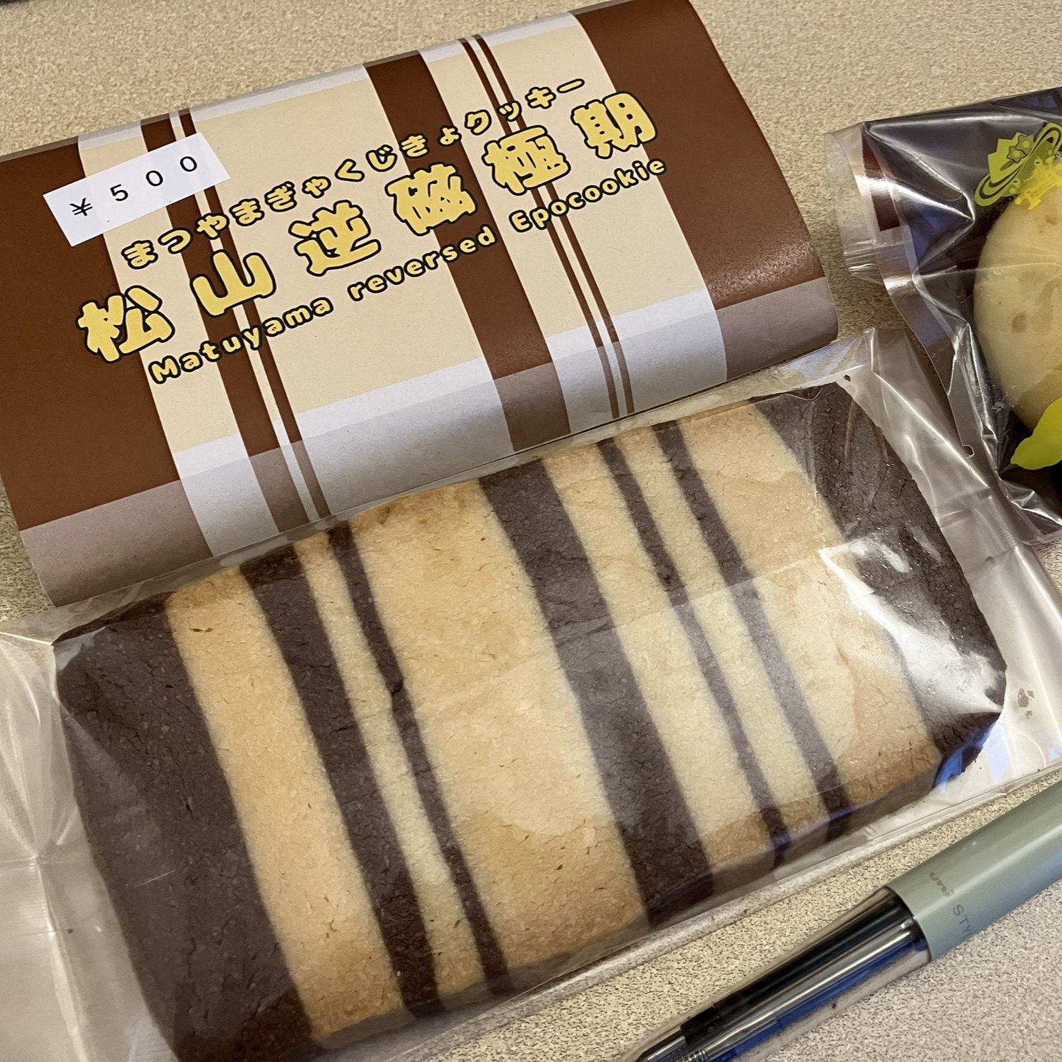 山陰海岸ジオパーク編の第7回目は、地磁気の逆転と松山逆磁極期のお話。 画像は、松山逆磁極期(ぎゃくじきょクッキー)。線の幅がちゃんと考えられていると思われます。1枚500円もするけど、かなり大きいです。 山陰海岸ジオパーク