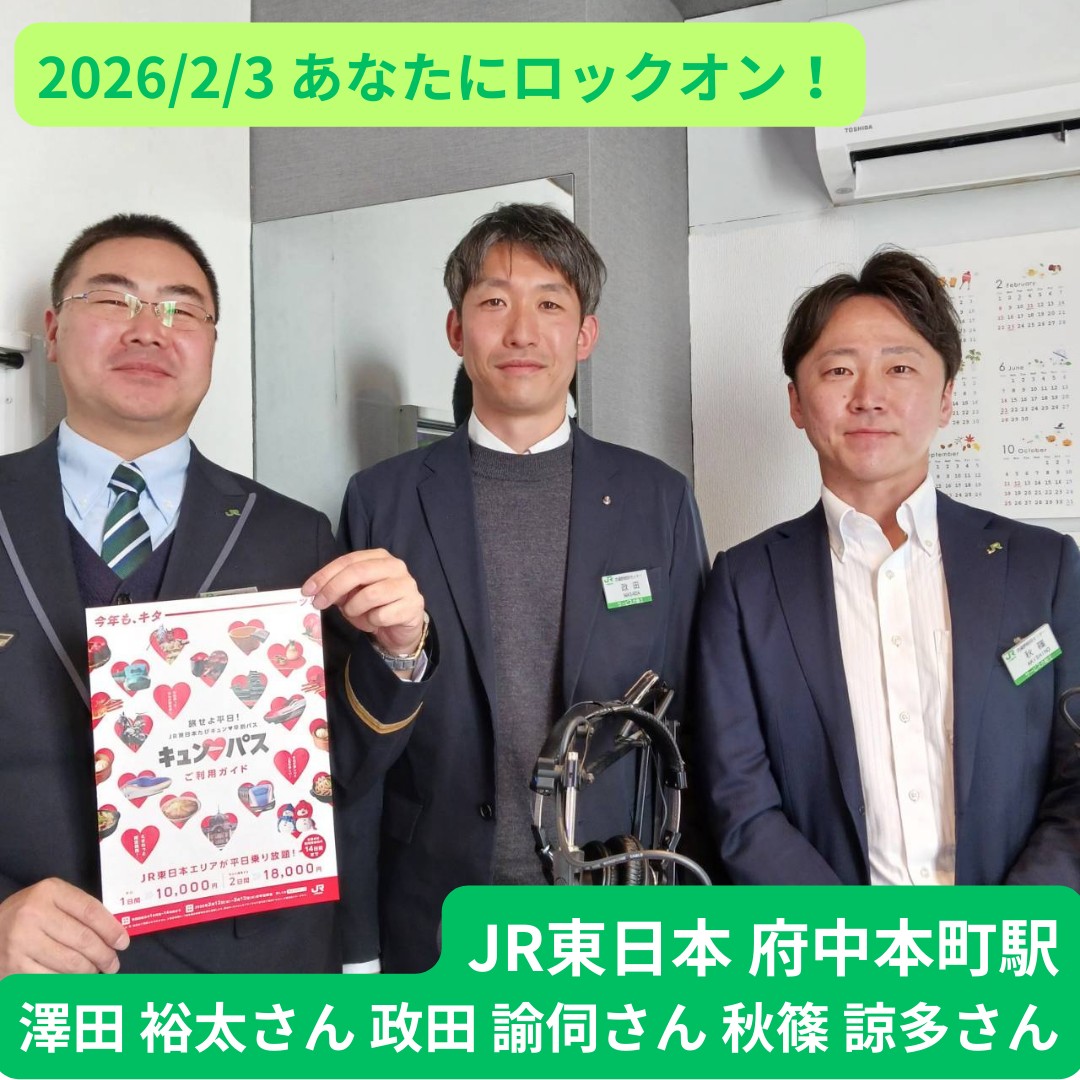 2026/2/3 あなたにロックオン! ゲスト JR東日本 府中本町駅 政田 諭伺さん、澤田 裕太さん、秋篠 諒多さん #もにりば #モーニングTAMAリバー #ラジオTAMAリバー #ラジオフチューズ #JR東日本 #鉄道 #府中本町駅 #駅員さん #車掌さん #好きそれだけ #キュンパス #電車でお出かけ #府中から宇宙 #府中市 #国立市 #稲城市
