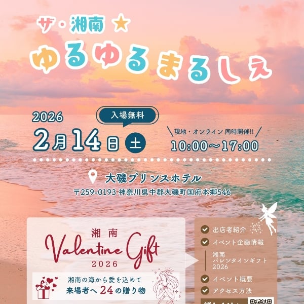 占い、癒されたい方、物販をいろいろ購入、体験できちゃう癒しのイベント[ザ・湘南ゆるゆるまるしぇ]が大磯プリンスホテルにて開催♡ 当日はバレンタインデー!愛を叶えたい方、癒されたい方、会場へGO 20以上の出店者さんからのプレゼントがいっぱい♡ ぜひ体験しにきてね 入場無料です。 #ザ・湘南ゆるゆるまるしぇ  #癒しのイベント #2026年スタート #占い #ヒーリング #マッサージ #物販 #大磯プリンスホテル