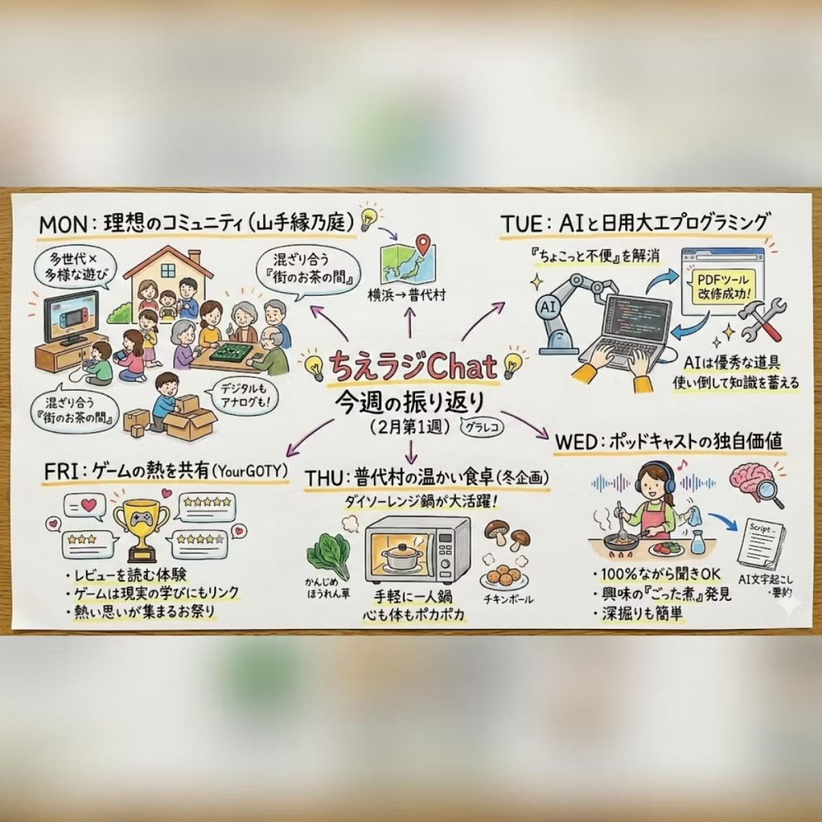 これらのソースは、ポッドキャスト番組「ちえラジ Chat」の2026年2月第1週の配信内容をまとめたものです。パーソナリティの高見知英氏が、地域コミュニティでの多世代交流の理想像や、AIを活用したプログラミングによる日常的な課題解決の可能性について自身の考えを述べています。また、ポッドキャストという媒体が持つ「ながら聞き」の利点や、未知の分野への興味を促す価値についても深く考察しています。さらに、岩手県普代村での自炊生活における鍋料理の楽しみや、ゲームレビュー企画を通じた他者との感情共有など、日々の活動や体験を幅広く記録しています。全体を通して、技術と地域活動を並行して進める著者の多角的なライフスタイルが綴られています。