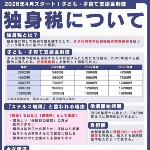 https://note.com/love4ever/n/n7b8fc0c8eb47 独身税4月から開始!!忘れてる人が多いと思うがまだ生きている法案だ。26年4月から開始、27年3月に7200円が徴収される。確かに高市内閣への期待度は大きい、その重要な試金石のひとつだ!