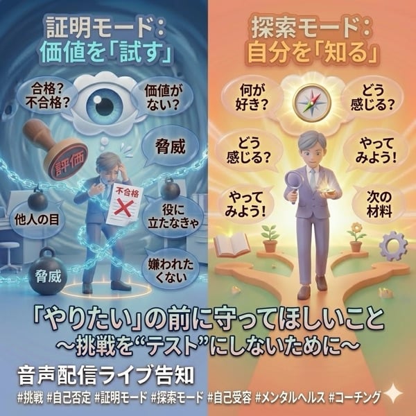 新しい学びの場や挑戦の場に入るとき、 私たちは知らないうちに「証明モード」で動いてしまうことがあります。 証明モードとは、 「自分は通用するのか」 「評価されるのか」を確かめる行動です。 この状態では、 選ばれないという結果が 「私は足りない」という意味に変換され、 強い傷になります。 本来の自己受容とは、 優しく振る舞うことではなく、 選ばれなくても存在の安全が揺れない状態です。 脅威が残ったまま対人支援をすると、 それは喜びではなく 安全維持の手段となり、疲れを生みます。 本当のwant toは、 評価から自由になったときに現れます。 挑戦は証明ではなく 探索として入ることで、 自分の反応を知る材料になります。 #自己理解 #挑戦の意味 #自己受容 #探究 #コーチング #リーダーシップ #want to