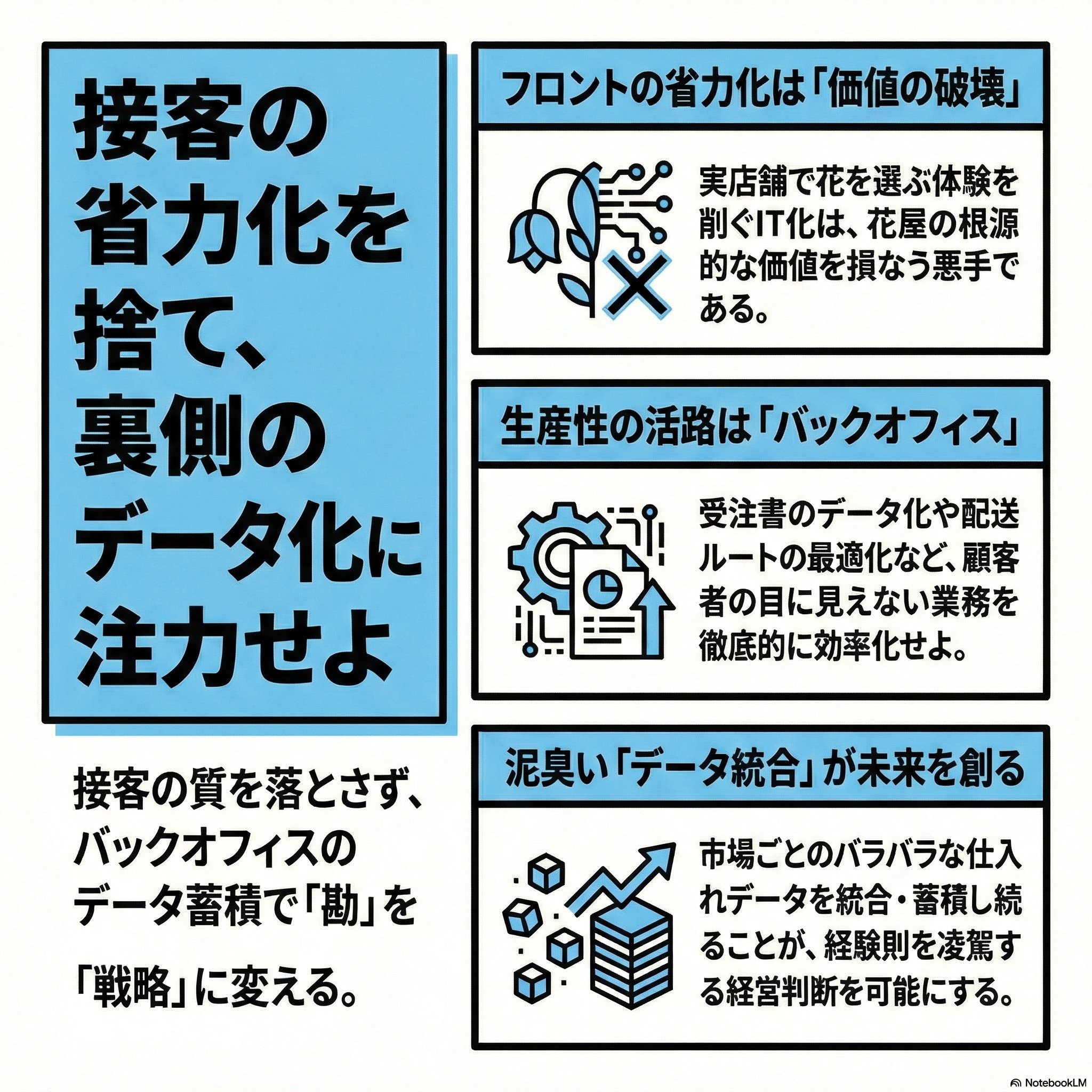 今回は、人手不足に悩む花屋経営者が陥る「効率化の罠」と、それを打破するための「バックオフィスの聖域化」について深掘りしました。
