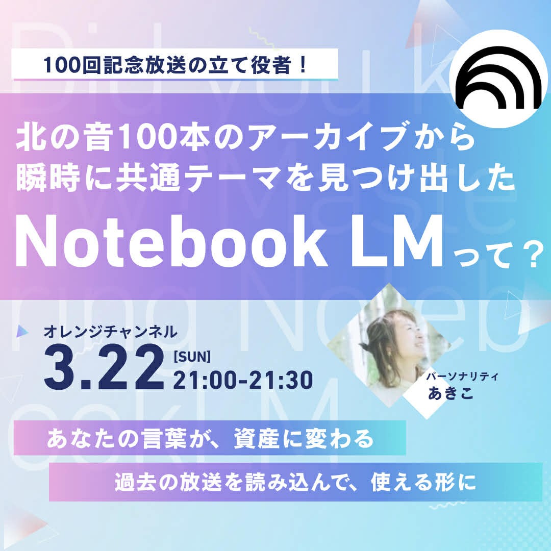 【第100回記念放送】で使ったAIツール「NotebookLM」を紹介します! 放送アーカイブやブログURLを読み込ませて、要約・共通テーマを抽出・台本の叩き台づくりまで、あなたのアーカイブが資産に変わる使い方をお話します。 さらに、仕事で使う膨大な資料の要約、画面収録データをまとめて議事録を作ってくれたりなどビジネスでの活用も