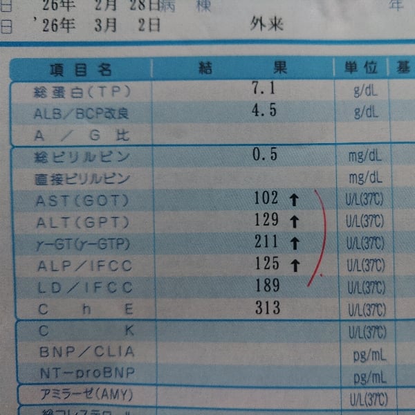 血液検査の結果は爆裂でしたか😂肝機能の数値は私も同じような数値でしたが中性脂肪の薬を飲むと下がると言われ飲んだら下りました。しいたけさんは体質から来ているのでは❓