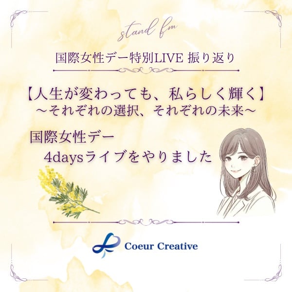 番組紹介 「自分らしさを育てる働き方デザイン」をテーマに、結婚・出産・育児・介護といったライフステージの変化に揺れながらも、自分らしく働きたいと願う女性たちへ、日々の気づきや働き方のヒントをお届けします。 今回の放送テーマ 今日は、3月6日〜9日に開催した国際女性デー特別ライブ4日間を振り返りました。フリーランスWebデザイナーのゆりさん、動画クリエイターのるみちゃん、5人のママWebデザイナーのちひろさん。それぞれ違う環境で、違う働き方をしている3人に共通していたこと。それは「自己決定」でした。 放送内のポイント • 国際女性デー特別ライブ4日間の振り返り • 1日目:ゆりさん「結婚しても、自分のキャリアを築く」 • 2日目:るみちゃん「自分で決める、という強さ」 • 3日目:れいこ単独「女性が自分らしく働くために」 • 4日目:ちひろさん「5人のママ、夢を追いかける」 • 共通点は「自己決定」。自分が望む働き方を自分で選ぶこと • ライフステージが変わってもキャリアを諦めない働き方 れいこのLINE ▼ご登録はこちらから https://step.lme.jp/landing-qr/2007170097-xbJM96rK?uLand=jlzluo ハッシュタグ #国際女性デー #女性の働き方 #自己決定 #キャリアデザイン #ライフステージ #フリーランス #在宅ワーク #シングルマザー #自分らしく働く #brillantglow