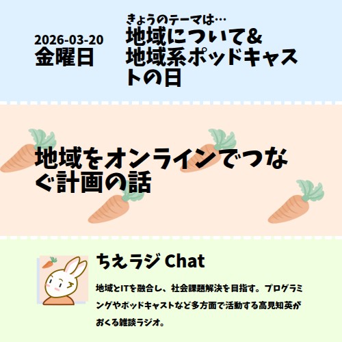3月の地域系ポッドキャストの日のテーマ 地域とインターネットということで、地域をオンラインでつなぐ計画について話しました。 #地域系ポッドキャストの日 #オンライン #声日記 #ちえラジ地域について