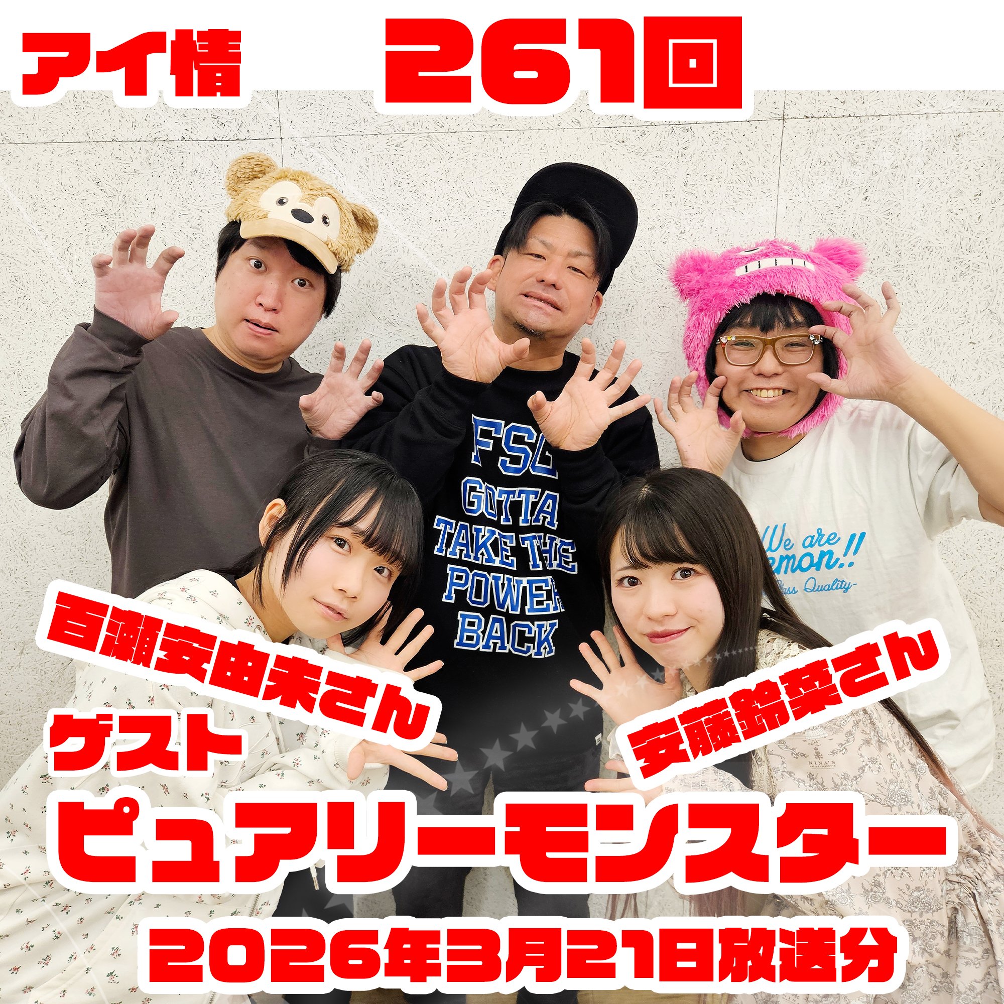 2026年3月21日放送の アイドル情報局、略してアイ情261回! 4/14に8thシングル「しゅがぴゅあ」をリリースする ピュアリーモンスターより 安藤鈴菜さん 百瀬安由未さん をゲストに迎えお送りします! メールを中心にお互いへの印象等 いろいろなお話を伺いました。 是非ともおききください!