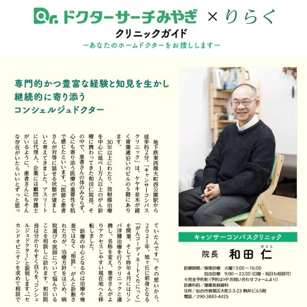 #キャンサーコンパスクリニック #仁先生 #希望の和だチャンネル #ドクターサーチみやぎ #りらく #クリニックガイド #がんコンシェルジュドクター #ホームドクター #セカンドオピニオン #軍師 #戦略 #寄り添う医療