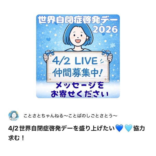 ことばのしごと ことさとさんの 4/2自閉症啓発デー、詳しい内容についてはこちらから https://stand.fm/episodes/69bf3de9300e8fcafc33987e