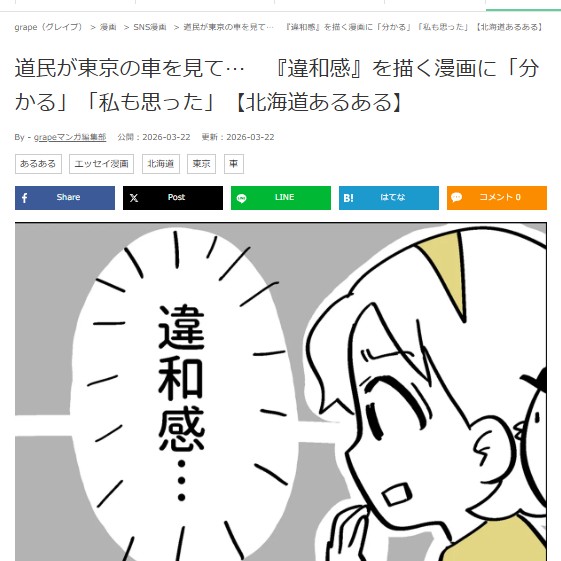 「なんか違うな…」って感じたこと、ありませんか? 東京で感じた違和感を描いた漫画が、 たくさんの「わかる!」につながりました。 あの違和感って、 ちゃんと意味があったんだな、って思えた出来事です。 そして4月からは、 地元・弟子屈町で『3人展』も開催✨ 作品づくりや、新しく作ったグッズのお話もしています🦊 \掲載された記事はこちら/ WEBメディアgrape 様 https://grapee.jp/manga/webcomic/2197827